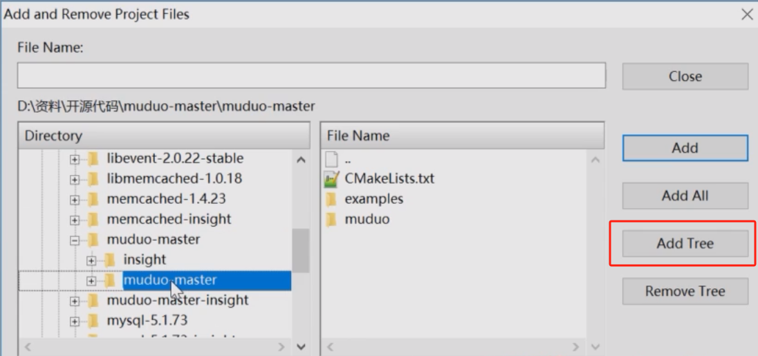 - 出现Add and Remove Project Files窗口,点击源码根文件夹,再点击右侧边的Add Tree按钮。添加完成后,Close此窗口即可。
