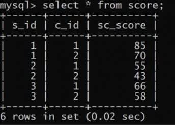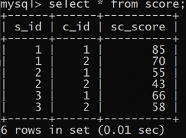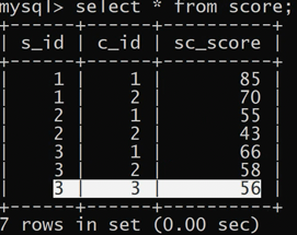 1 | insert into score values(3, 3, 56); |