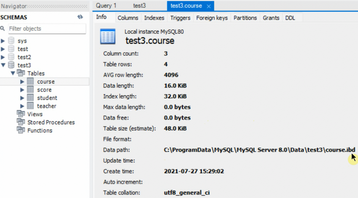 ls后发现,每个数据库都会有一个同名的文件夹,里面存放着库中的表。- 进一个文件夹,发现里面每一张表都对应有多种后缀名不同的文件。