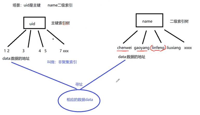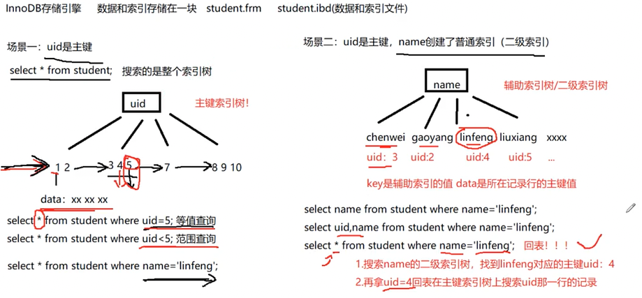 回表是指,查到name索引树中linfeng对应的uid后,去主键索引树再找uid对应的一整行记录。