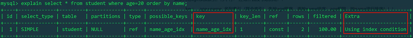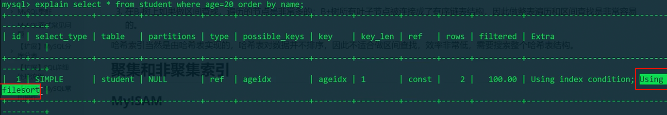 1 | explain select * from student where age = 20 order by name; |