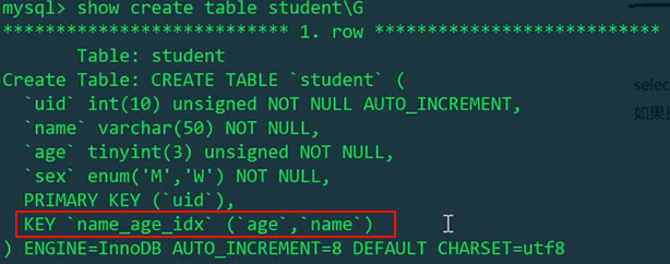 发现,下面多了一个KEY nameidx(name)。