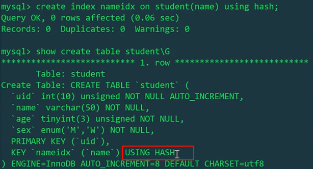 1 | create index nameidx on student(name) using hash; |