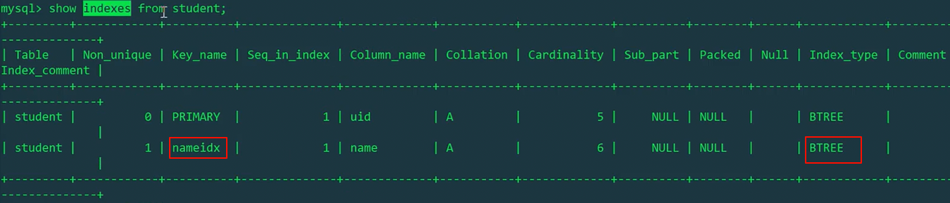 1 | CREATE INDEX nameidx ON student(name); |