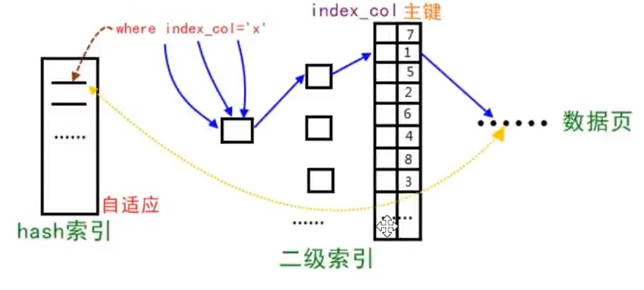 InnoDB存储引擎会监测:如果同样的二级索引不断被使用,那么它会根据这个二级索引,在内存上根据二级索引树(B+树)上的二级索引值,在内存上构建一个哈希索引,来加索搜索。