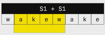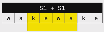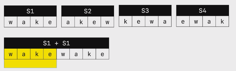 发现,可以让原串重复一次,成为wakewake。发现,wake的旋转词都能在这个重复串中找到子串。