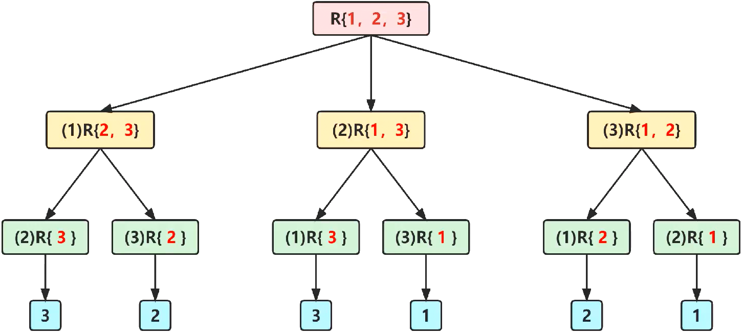 在第i层视角上,集合内每个元素都依次与第i个位置进行交换。如下图:元素1到了第1的位置,则出现:(1)R{2,3},元素2到了第1的位置,则出现:(2)R{1,3},元素3到了第1的位置,则出现:(3)R{1,2}。