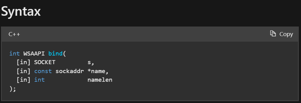 1 2 3 4 5 6 7 8 9 10 11 12 13 14 15 16 17 18 19 20 21 int main () { sockaddr_in local; local.sin_family = AF_INET; if (1 != inet_pton (AF_INET, "127.0.0.1" , &local.sin_addr)) { return 1 ; } local.sin_port = htons (10000 ); if (SOCKET_ERROR == ::bind (sock, reinterpret_cast <const sockaddr*>(&local), sizeof (local))) { err = ::WSAGetLastError (); return 1 ; } }