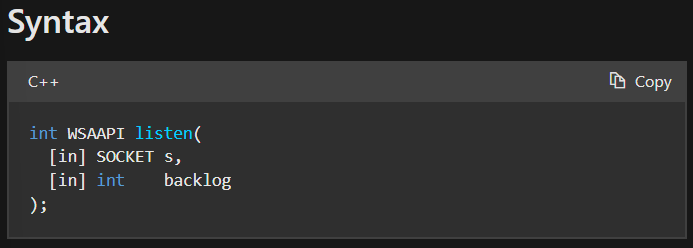 1 2 3 4 5 6 7 8 9 10 11 int main () { if (SOCKET_ERROR == ::listen (listen_sock, 1 )) { err = ::WSAGetLastError (); return 1 ; } }