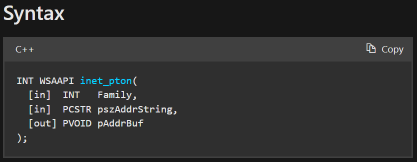 1 2 3 4 5 6 7 8 9 10 11 12 13 14 int main () { char *echo_host = "192.168.1.20" ; int ehco_port = 7 ; struct sockaddr_in *server = (struct sockaddr_in*)malloc (sizeof (struct sockaddr_in)); server->sin_family = AF_INET; server->sin_port = htons(echo_port); in_addr . s_addr(is a #define of 'S_un.S_addr' , S_addr is a u_long) so, sockaddr_in.in_addr.S_un.S_addr server->sin_addr.s_addr = inet_addr(echo_host); }