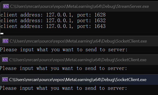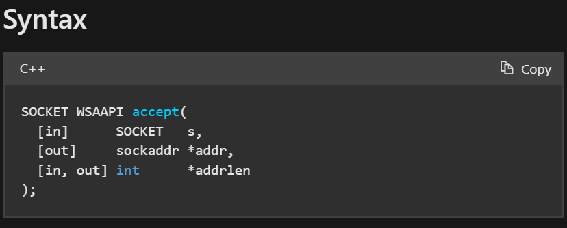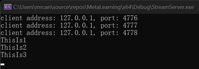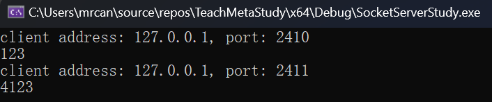 1 2 3 4 5 6 7 8 9 10 11 12 13 14 15 16 17 18 19 20 21 22 23 24 25 26 27 28 29 int main () { while (true ) { std::jthread t ([client_addr, work_sock]() mutable { wchar_t addr_str[46 ] = L"" ; InetNtopW(AF_INET, reinterpret_cast <void *>(&client_addr.sin_addr), addr_str, 46 ); std::wcout << std::format(L"client address: {}, port: {}\n" , addr_str, ntohs(client_addr.sin_port)); ::closesocket(work_sock); work_sock = INVALID_SOCKET; }) ; t.detach (); } ::closesocket (listen_sock); listen_sock = INVALID_SOCKET; ::WSACleanup (); return 0 ; }