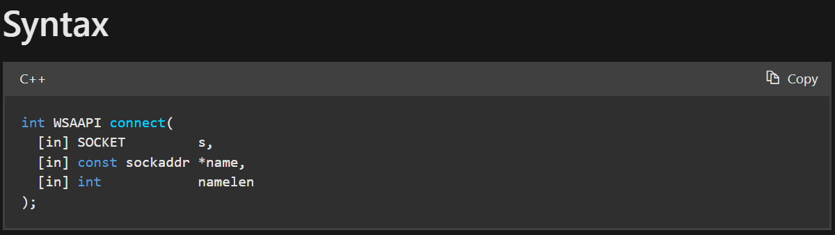 1 2 3 4 5 6 7 8 9 10 { if (SOCKET_ERROR == ::connect (sock, reinterpret_cast <const sockaddr*>(&server_addr), sizeof (server_addr))) { err = ::WSAGetLastError (); return 1 ; } }