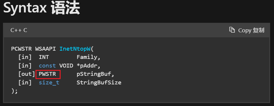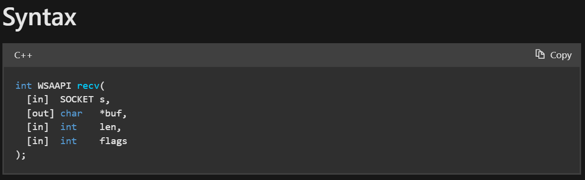 1 2 3 4 5 6 7 8 9 10 11 int main () { wchar_t buf[100 ] = { 0 }; int bytes_received = ::recv (work_sock, reinterpret_cast <char *>(buf), sizeof (wchar_t ) * sizeof (buf), 0 ); if (bytes_received > 0 ) { std::wcout << buf << std::endl; } }