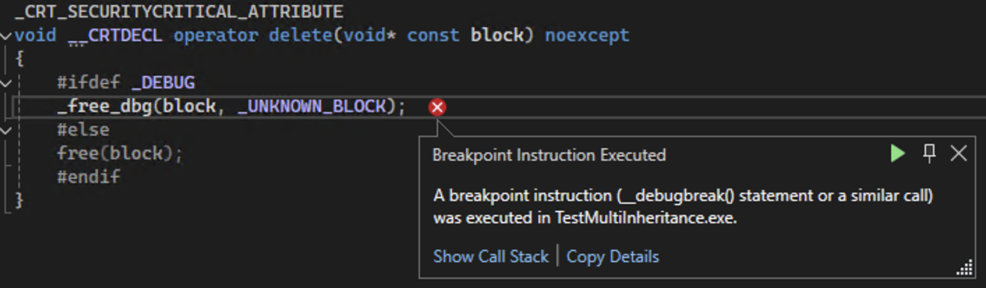 调用func没问题,输出call B::func,但最终会崩溃报错:(注意,以下讨论均基于Windows VS编译器环境,据说Linux g++环境下delete p时p会自动偏移回B的位置导致不崩溃,待测试)