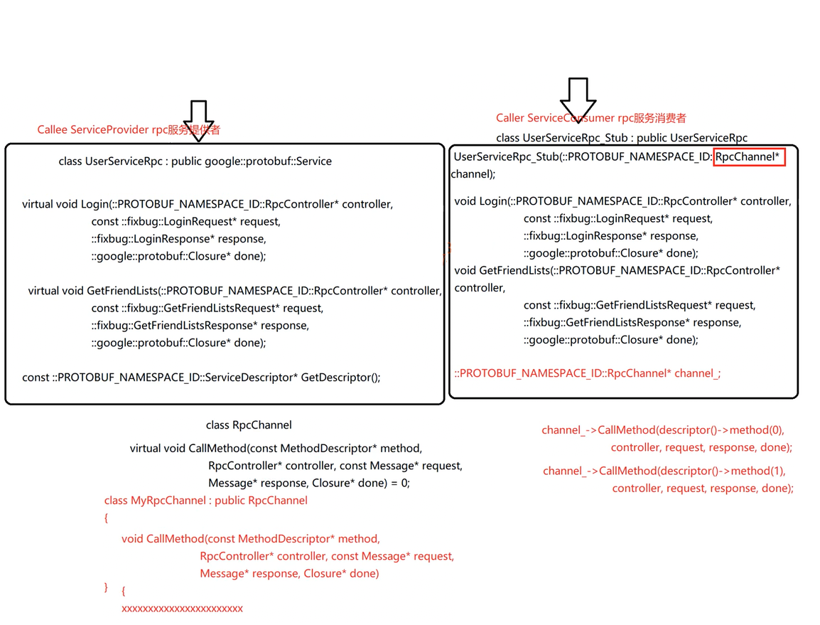 说明,需要自定义一个MyRpcChannel,继承于RpcChannel,并实现具体的CallMethod。在构造Stub类对象时,传入此MyRpcChannel。