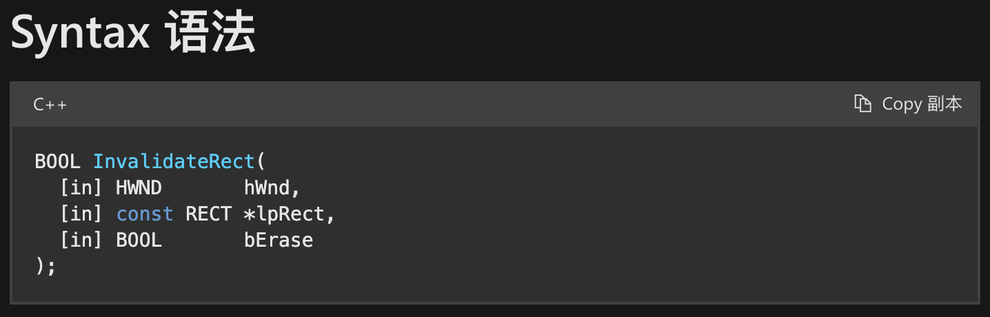 - 参数2:指向RECT结构的指针,该结构包含要添加到更新区域的矩形的工作区坐标。如果此参数为NULL,则将整个客户区添加到更新区域。